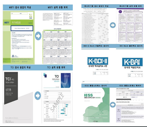 IESS(통합스트레스검사), K-BDI-Ⅱ(한국판 백우울척도), 사건충격척도 IES-R, 자존감 자가검사 SEI, 불안척도검사 BAI, 부모양육태도검사